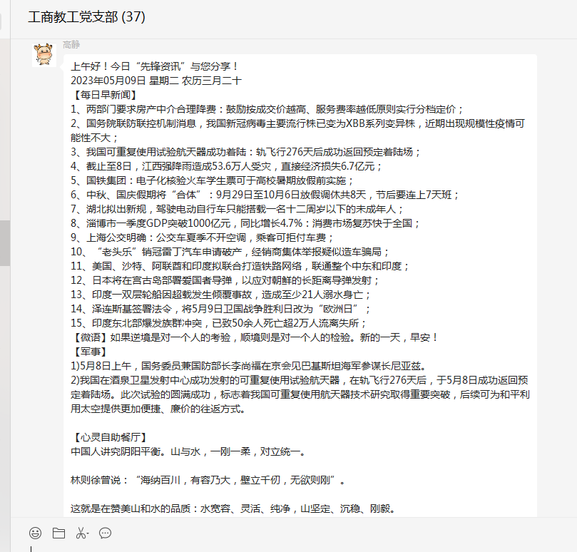 “先锋资讯”栏目包含新闻播报、心灵自助餐厅、党务百科等板块内容。让全体党员以快捷方式知晓天下新闻,心灵适时得到净化和引领,并且充实了党课教育的内容。各个板块之间内容交互融合,形成合力,全方位提升了党员老师的综合素质。此活动以微信群为载体,要求大家每天打卡学习,使得党员老师可以时刻关注活动的最新进展,学到先进的典型经验。通过互动学习,相互交流,激发了全体党员的学习热情。大家纷纷表示一定要用系统观念,在一体推进上持续用力,把学习和实干结合起来,推动jinnianhui今年会的工作走向高质量发展的新阶段。(编辑:景勤娟   审核:韩晓霞)