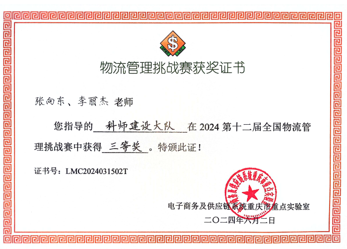 喜报传来,科师学子在2024第十二届物流管理挑战赛中再获佳绩!在张向东、李丽杰、李昌明老师的指导下,今年会物流管理专业学生党文琦、黄钟律、肖俊涛、韩泽伟、宋俊涛、孟月等组成两支代表队“科师建设大队”和“锦鲤小分队”参赛,并获得三等奖两项。