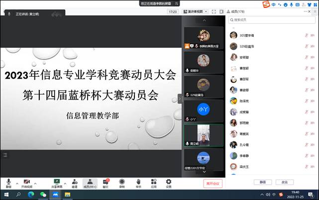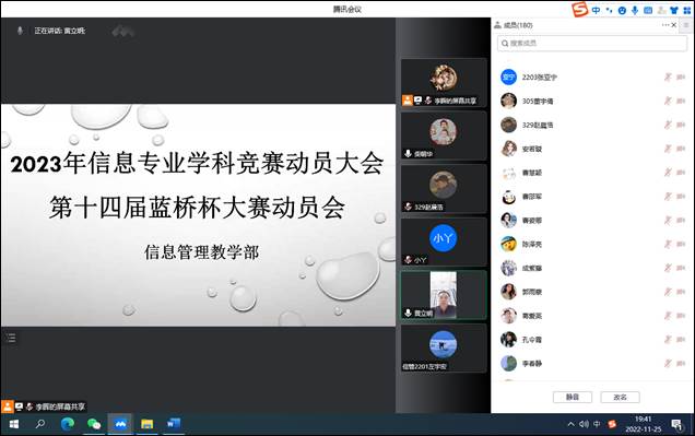 2022年11月25日晚,信息管理教学部召开了2023年信息专业学科竞赛动员大会,会议通过腾讯会议线上举行。信息管理教学部的教师、信息专业各年级全体学生参加了此次动员大会。