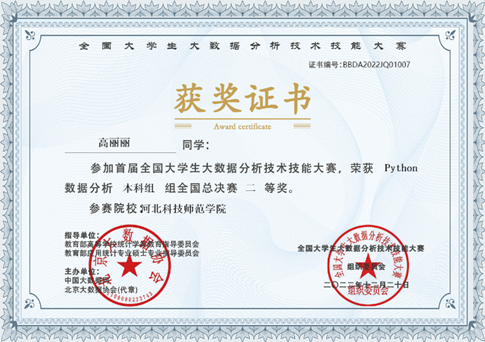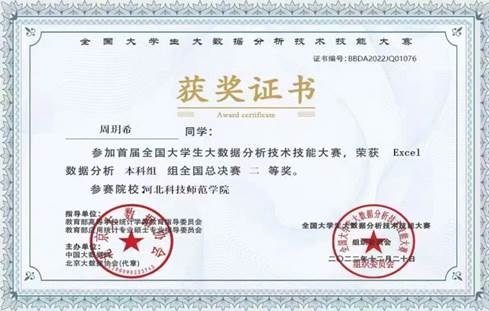 该项比赛是在教育部高等学校统计学类教育指导委员会、教育部应用统计专业硕士专业指导委员会的共同指导下,由中国大数据网联合北京大数据协会联合启动。大赛包括Excel数据分析和Python数据分析两项赛项,周玥希、高丽丽两位同学在2022年11月举行的该项大赛省赛中获得一等奖,取得了参加全国赛的资格。现代表今年会在该项大赛全国总决赛中取得佳绩,可喜可贺。(撰稿人:柴朝华,审核人:刘海滨)